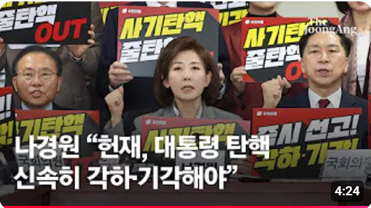 지난달 31일, 여당 의원 30명은 나경원 의원을 대표로 헌재가 대통령 탄핵을 신속히 각하, 기각해야한다는 내용의 연설을 했어요. 민주당 측 시위를 '불법 시위'라고 비판했어요. 헌법재판관 개인에 대한 도를 넘는 신변의 위험이 계속되고 있는 만큼, 신속한 판결을 촉구했습니다. 종합하자면, 나 의원을 비롯한 여당 의원들은 이전에 발송한 1차, 2차 탄원서에 따라서 탄핵을 기각 또는 각하해야 한다고 강조했습니다.